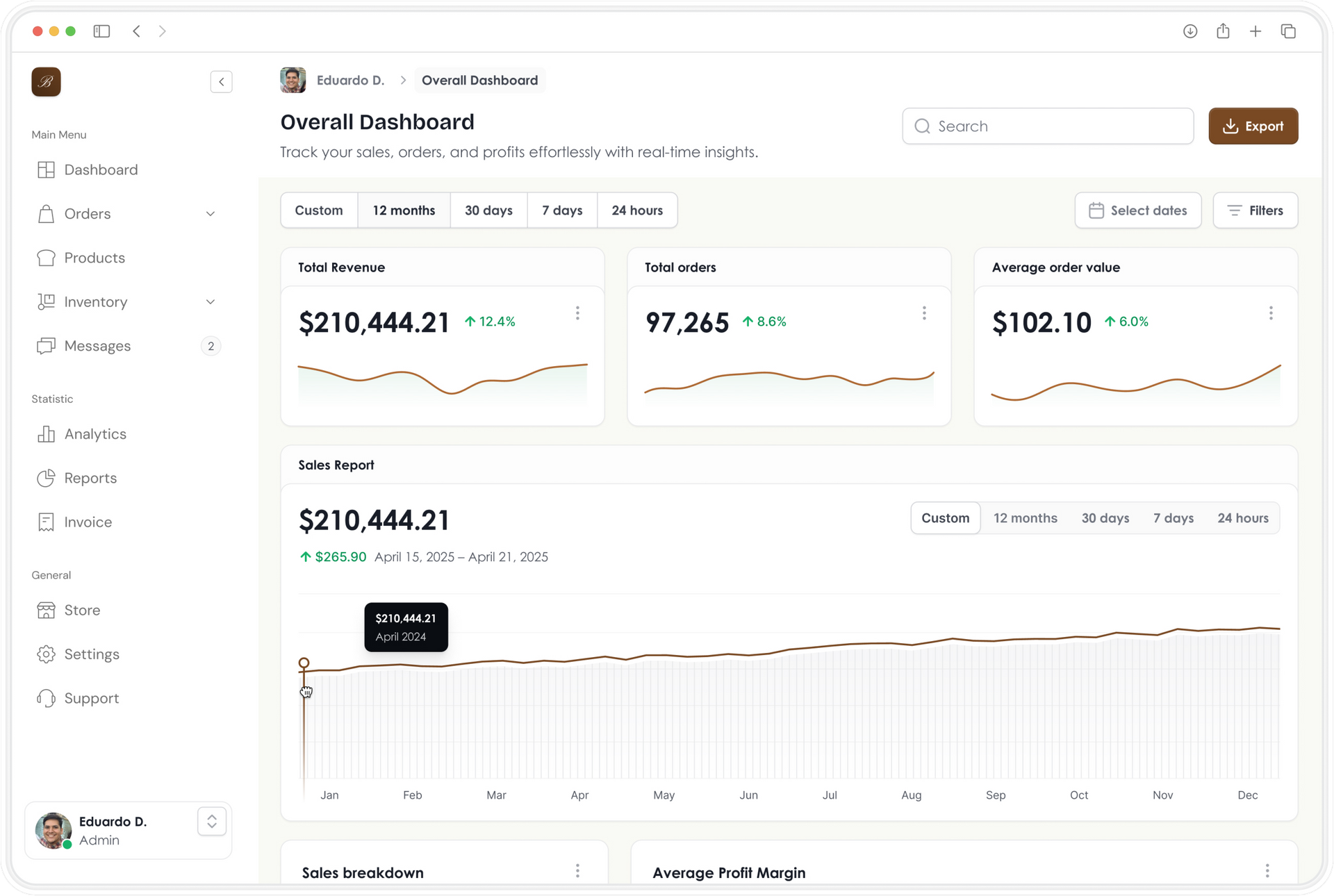 The dashboard empowers the bakery team with self-managed tools that remove the need for constant developer support. Employees can update product details, adjust pricing, manage availability, and monitor inventory levels in real time. Orders are organized into clear categories—like in-transit, delivered, and reseller—giving the team instant visibility and reducing communication gaps across roles.